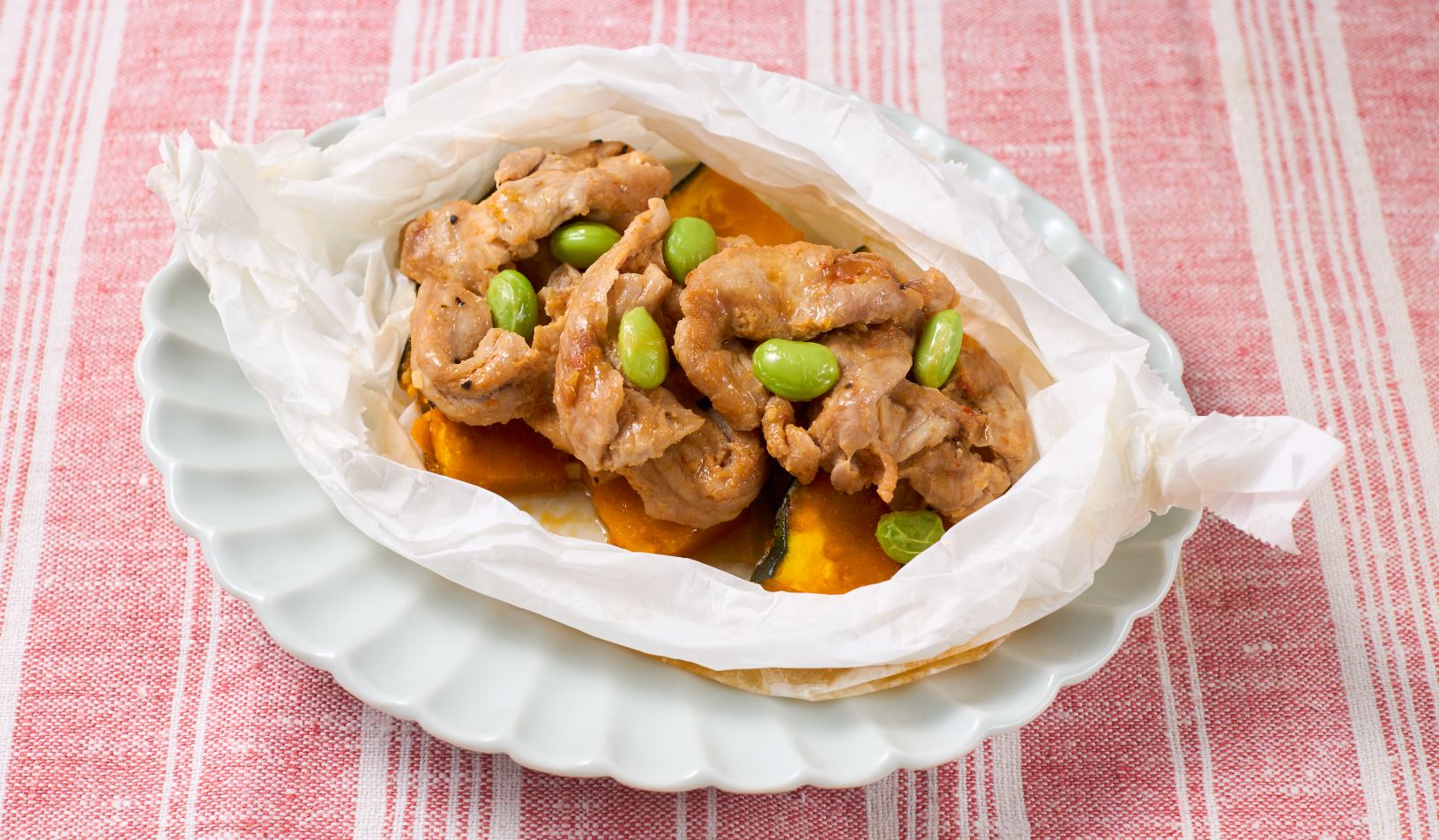 ➋25cm角くらいのオーブンシートを2枚広げ、それぞれの中央にかぼちゃを半量ずつ並べる。その上に豚肉を半量ずつのせ、えだまめをちらし、包んで両端をねじる。