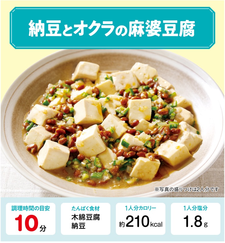 ひき肉の代わりに納豆とオクラを使った、低カロリーの麻婆豆腐です。片栗粉を使わず、納豆とオクラのネバネバでとろみをつけます。オクラのネバネバ成分の正体は、ペクチンという水溶性の食物繊維で、糖やコレステロールの吸収を抑える働きも。あっさりしているので、食欲がないときにもぴったりのおかずです!
