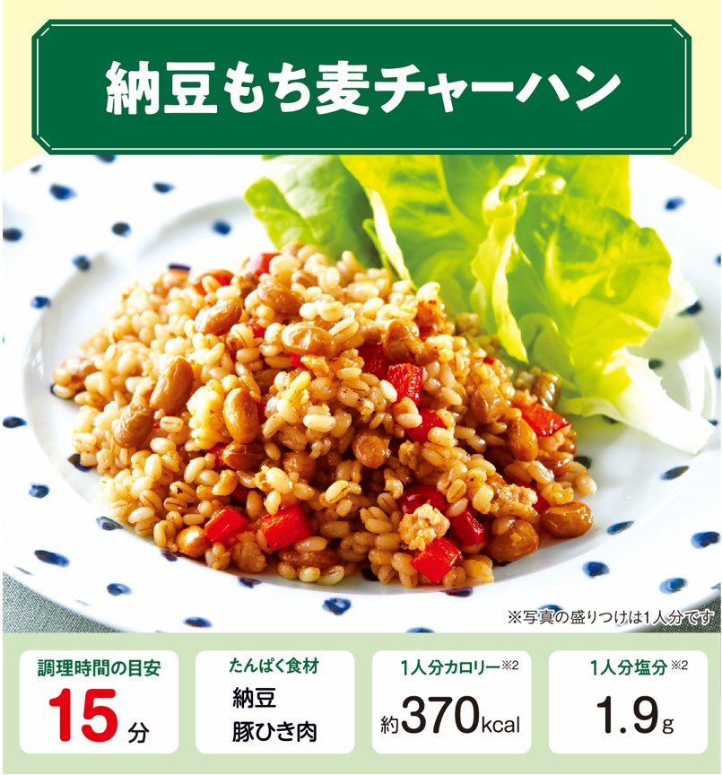 もち麦の食物繊維の含有量は白米の約9倍もあり、とくにβ-グルカンという水溶性食物繊維を豊富に含んでいます。B-グルカンは水分を吸収してゼリー状に固まる性質があり、胃腸内をゆっくり移動するため、糖質の吸収をゆるやかにして、食後の血糖値上昇を抑える働きがあります。パラパラに仕上がるもち麦 は、チャーハンにピッタリですよ!