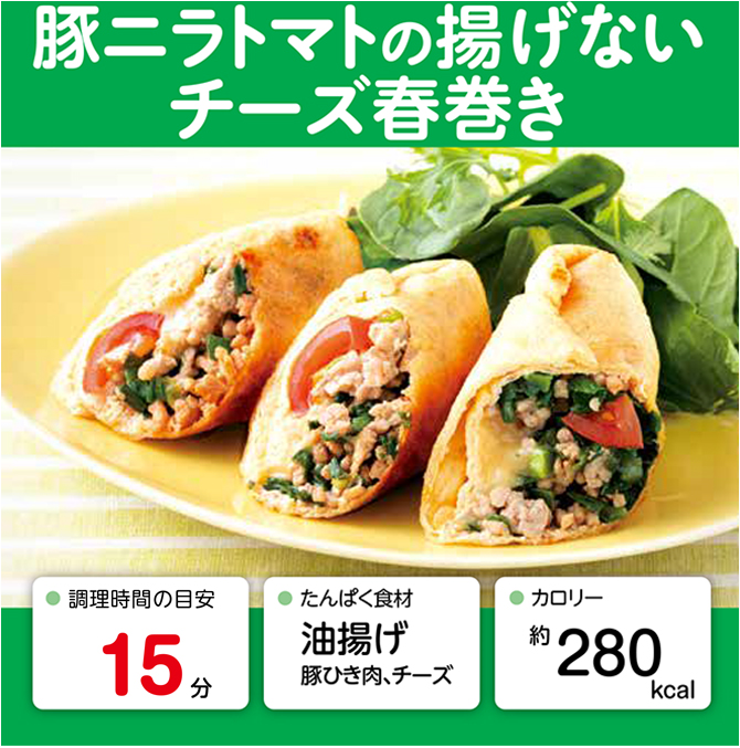 春巻きの皮は通常、小麦粉でできているので、「ごはんを食べて、そのうえおかずでも炭水化物をとるのは糖質過多が気になる」という方もいるのではないでしょうか。そういう方には、代わりにたんぱく源である油揚げを使った今回のメニューがおススメ。しかも油で揚げていないのでカロリーもオフ。油揚げは薄手のものが開きやすくおすすめです。