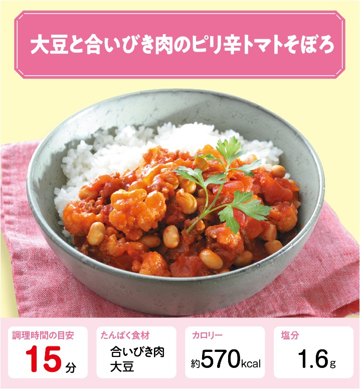 合いびき肉は、手軽に使える便利な食材ですが、たくさんとると、どうしてもカロリーが高くなりがち。そんなときは、動物性と植物性のたんぱく質を一緒にとる、ダブルたんぱく質がおススメ。カロリーを抑えながら、たんぱく質もしっかりとれますよ。