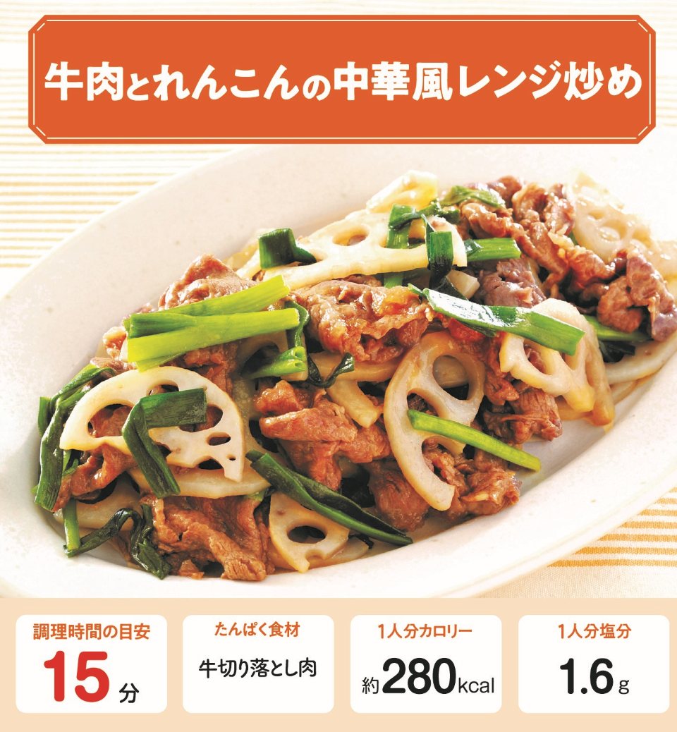 <作り方>➊牛肉は一口大に切り、[A]を加えてもみ込む。れんこんは3mm幅の半月切りにして水に5分ほどさらし、水気を切る。万能ねぎは5cm長さに切る。