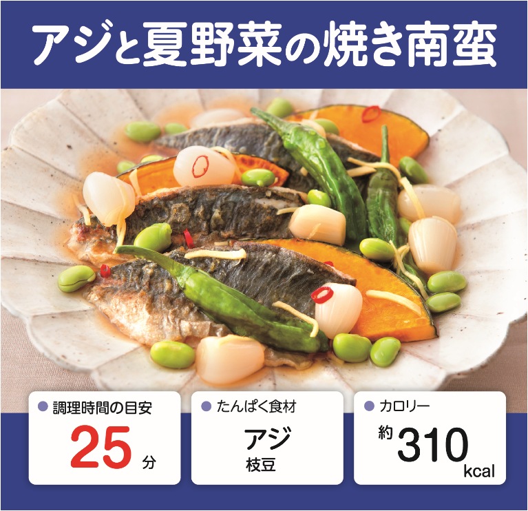 高たんぱくで脂肪、ビタミンB群、カルシウムやミネラルがバランスよく含まれ、さらにDHA、EPAや必須アミノ酸も豊富に含むアジ。食欲が落ちるこの時期に積極的にとりたい方には、酢に漬けることでさっぱりといただける南蛮漬けがおススメです。