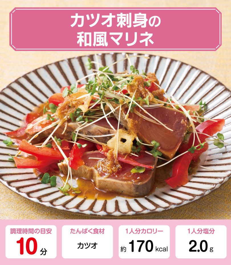 刺身を野菜と和えるだけでメインのおかずに。焼くのが面倒なら、市販のカツオのたたきで代用可。ニンニクも省いて OK です。漬け汁が多めなので、レタスなどを加えても◎。