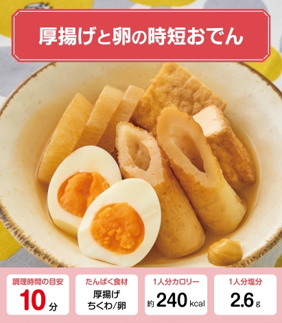 厚揚げの代わりに焼き豆腐や油揚げ、ちくわの代わりにさつま揚げやはんぺんでもいいですよ。大根は薄めに切ってレンジ加熱することで時短になり、短時間でも味が染み込みやすくなります。
