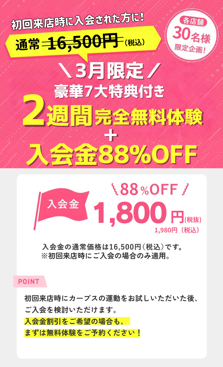 2週間完全無料で体験できるのでカーブスがご自身に合っているかを試したい方、効果を実感したい方にも無料体験は大変オススメです