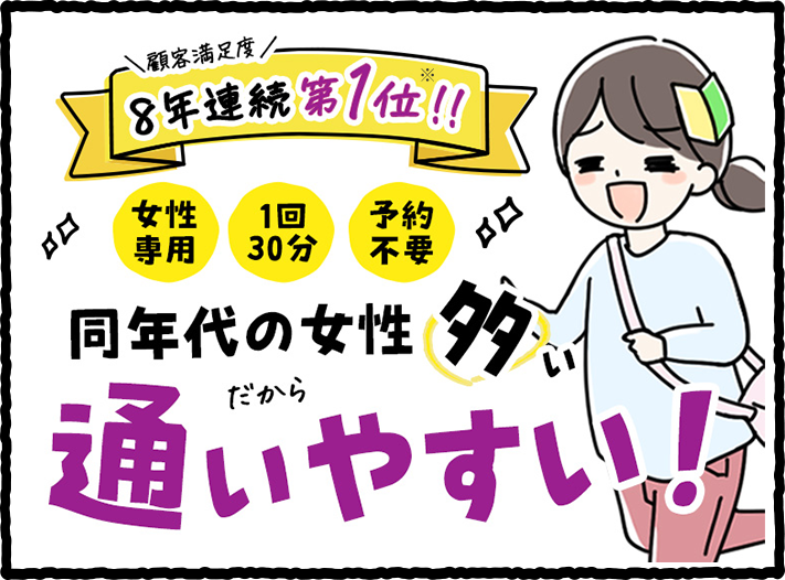 顧客満足度11年連続第1位 女性専用 1回30分 予約不要 同年代の女性が多い だから通いやすい!