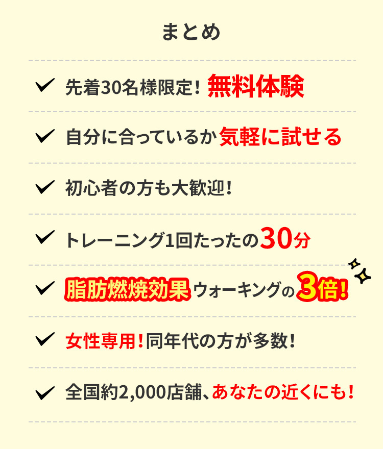 まとめ 先着20名様限定!無料体験 自分に合っているか無料で試せる 初心者の方も大歓迎! トレーニング1回たったの30分 脂肪燃焼効果ウォーキングの3倍! 女性専用!同年代の方が多数! 全国約2,000店舗、あなたの近くにも!
