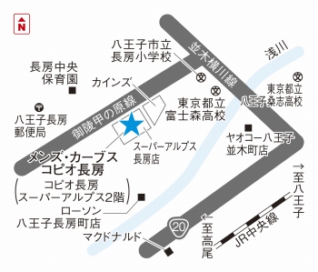 - バス停(カインズ八王子長房店前)から徒歩1分/コピオ長房入って正面左手にあるエスカレーターで2階に上がり、渡辺医院様前を折り返して突き当りまで進むとメンズ・カーブスがあります。