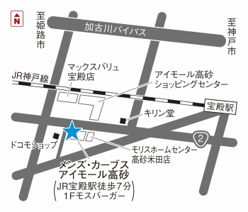 - 宝殿駅徒歩7分/2号線沿いのモスバーガーさん店舗入り口の右手、青い屋根のある入り口から2階に上がるとメンズ・カーブスがあります。