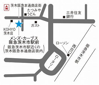 - 阪急茨木市駅より徒歩3分/阪急本通商店街内/阪急茨木市駅から阪急本通商店街に入ってすぐ、1つ目の十字路左手にメンズ・カーブスがあります。