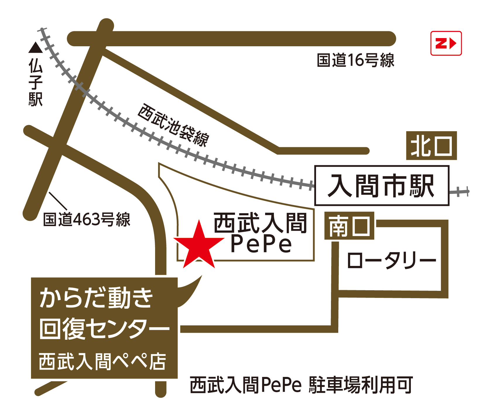 西武池袋線「入間市駅」南口から徒歩1分、駅直結のビル「西武入間ペペ」3Fです。館内中央のエスカレーターより3階に上がり、左手に見えるHobby Boxさんの右隣がからだ動き回復センターです