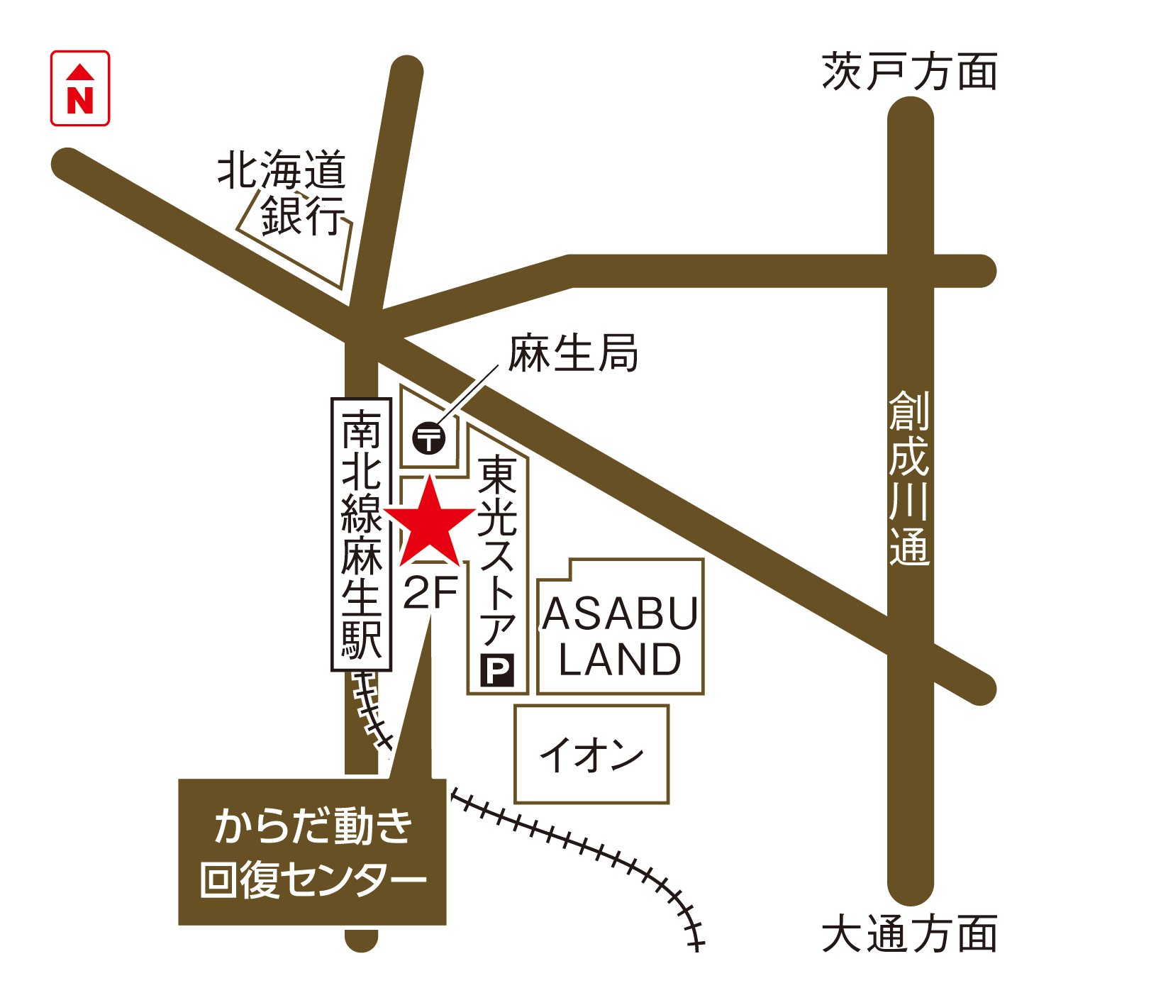 札幌市営地下鉄南北線「麻生駅」が最寄り駅です。4番出口から徒歩約2分(約104m)でアクセスできます。4番出口を出て左手、富士メガネさんのある通りを直進すると東光ストア麻生店があり、2階カーブスの横がからだ動き回復センターです