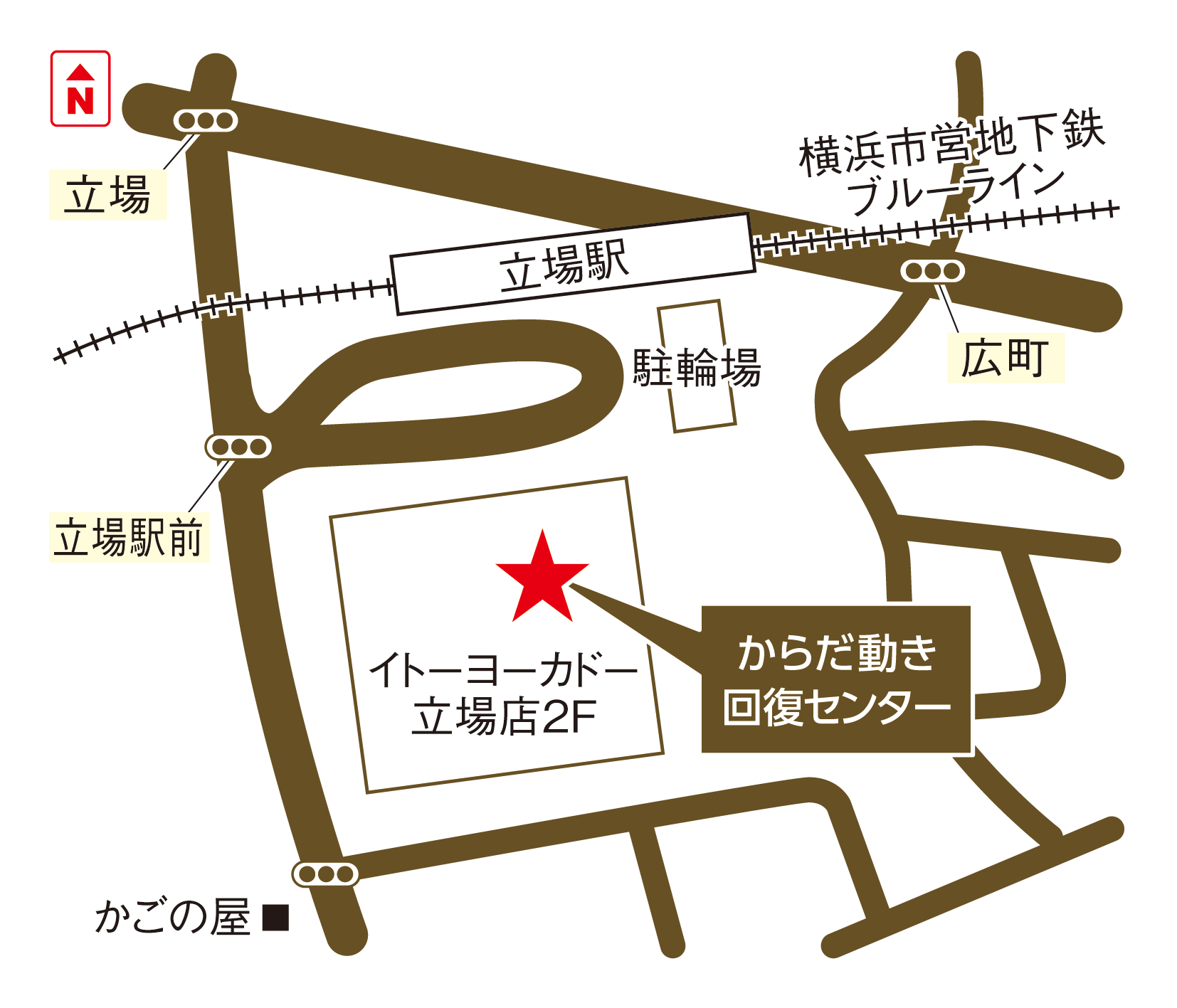 横浜市営地下鉄「立場駅」の3番出口徒歩1分、イトーヨーカドー立場館内2階、ハニーズさんのお隣がからだ動き回復センターです
