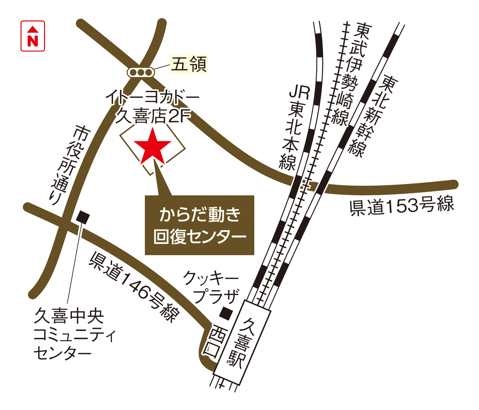 <電車の場合> JR宇都宮線・東武伊勢崎線「久喜駅」西口 徒歩約10分 <バスの場合> 大和観光バス 久喜駅 西口 アリオ鷲宮行 乗車(約2分)→ 中央4丁目下車 徒歩約5分。中央4丁目バス停で降り、対面の道路へ渡り駅の方面に歩きます。丸善ハウジングさんの先の角を左折し、しばらく直進します。左手にSUPERHOTELさんが見えたら先の角を左折し直進するとイトーヨーカドー久喜店がございます。館内2階にからだ動き回復センターがございます