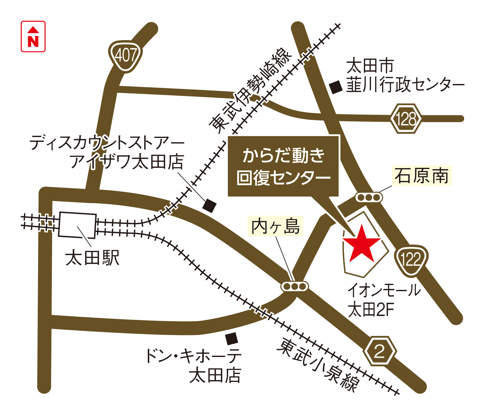 東武伊勢崎線「太田駅」で降りて、南口からシャトルバスで約10分。東武太田駅南口よりイオンモール太田への乗入れバスが毎日運行します。館内2階イオン側エスカレーター付近WOOOPS!さんのお隣がからだ動き回復センターです