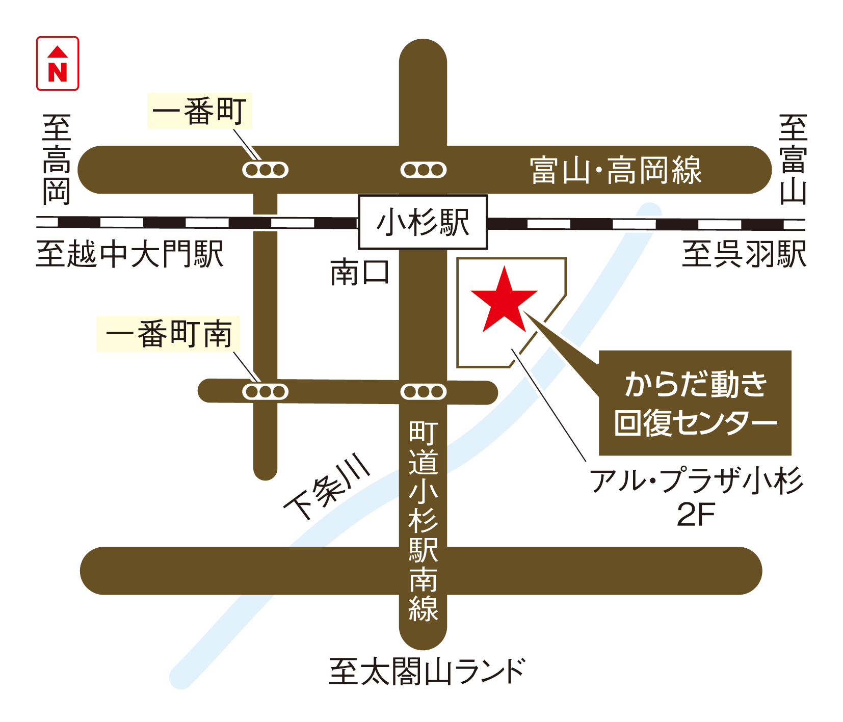 JR北陸新幹線「小杉駅」から徒歩2分。小杉駅南口をでて左手にアルプラザ小杉がございます。館内2階Book‘sフナキさんのお隣がからだ動き回復センターです