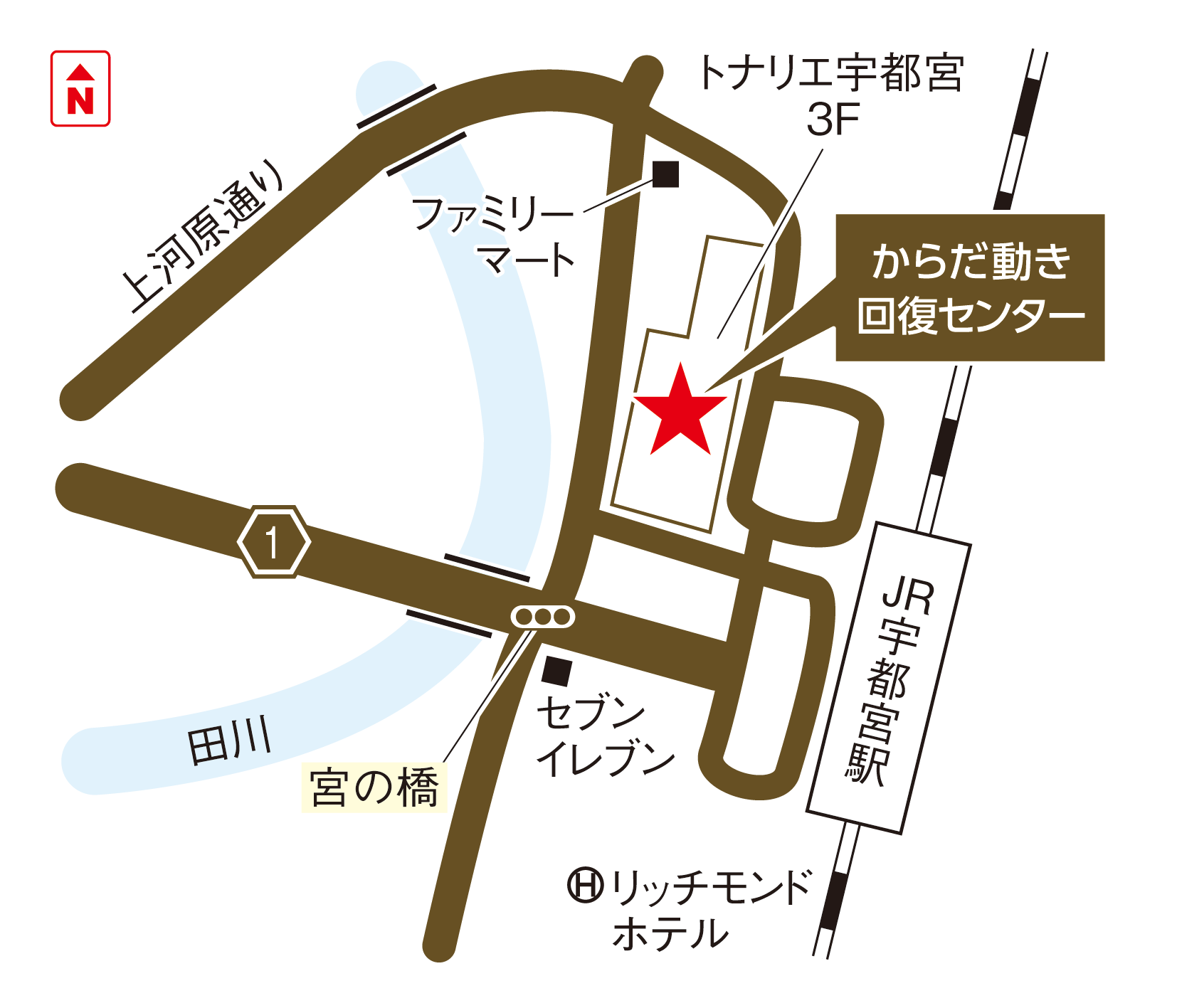 JR宇都宮駅西口、JR宇都宮駅西口バス停から徒歩1分。トナリエ宇都宮(ヤオコー、ヨドバシカメラが入っている建物)3階、ナイスネイルさんのお隣がからだ動き回復センターです <車の場合> 駅ロータリーを左に進み、トナリエ宇都宮の建物を左手に見ながら直進。東横インの向かいP駐車場に入る。 館内駐車場割引サービスあり