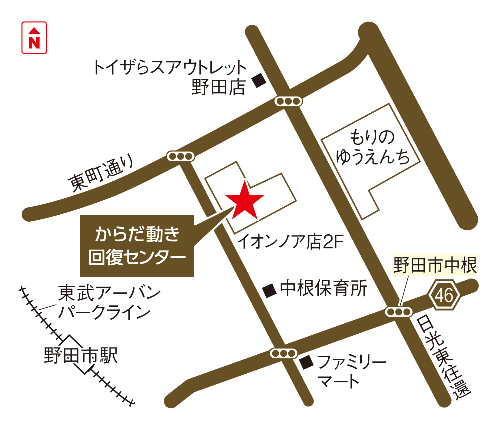 野田市駅を出て、3・4・29号野田市駅前線を右折します。突き当りを右折し、しばらく道なりに進みます。セブンイレブンさんがある4つ角を、右折しまたしばらく直進します。右手にFROZEN MARKETさんがある交差点を右折し、しばらく直進すると左手にイオンノアがあります。館内2階、ボーリングアミューズメントシティラクゾーさんのお隣がからだ動き回復センターです