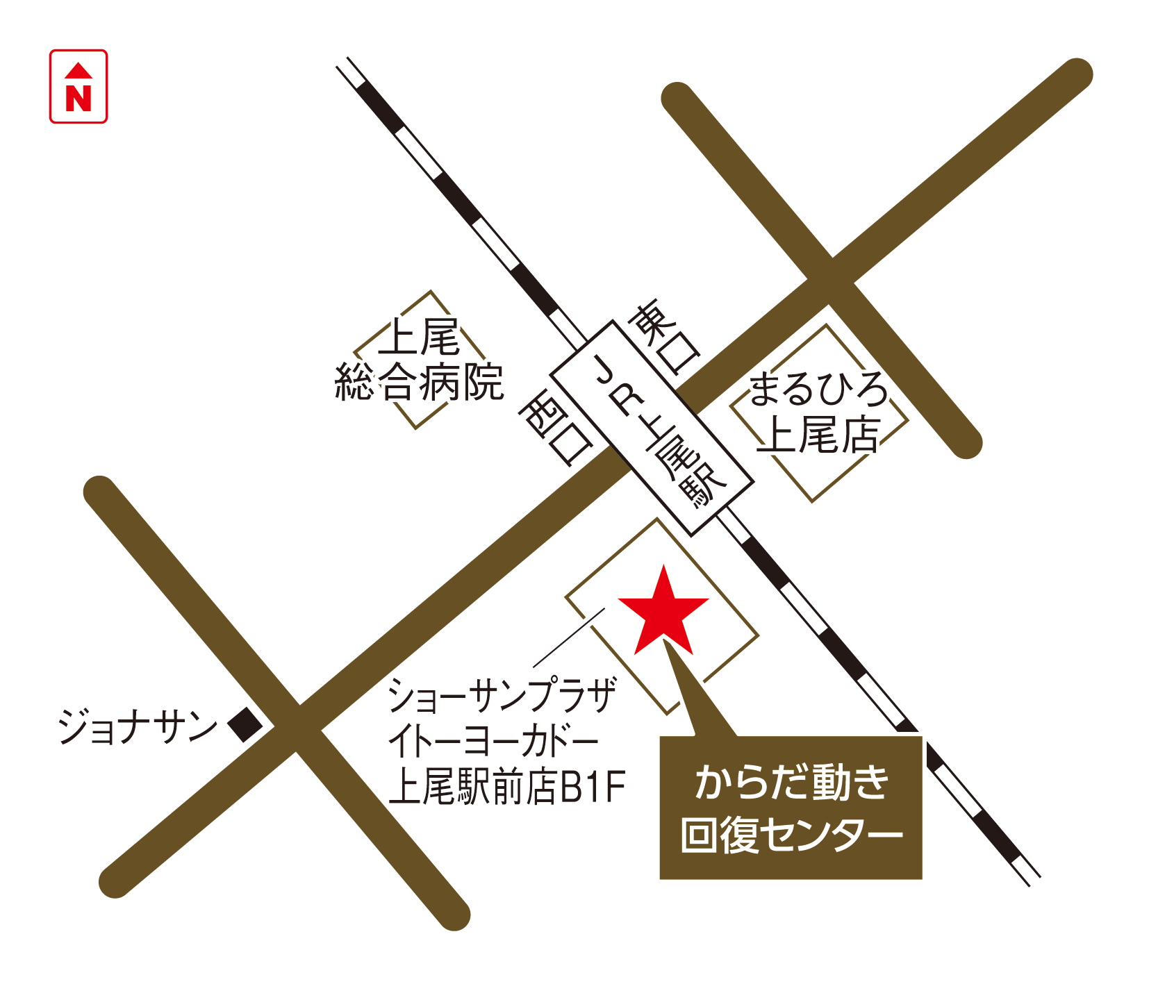 JR高崎線「上尾」駅西口徒歩2分(ペデストリアンデッキ直結)。館内B1階お茶のすず㐂さんのお隣がからだ動き回復センターです