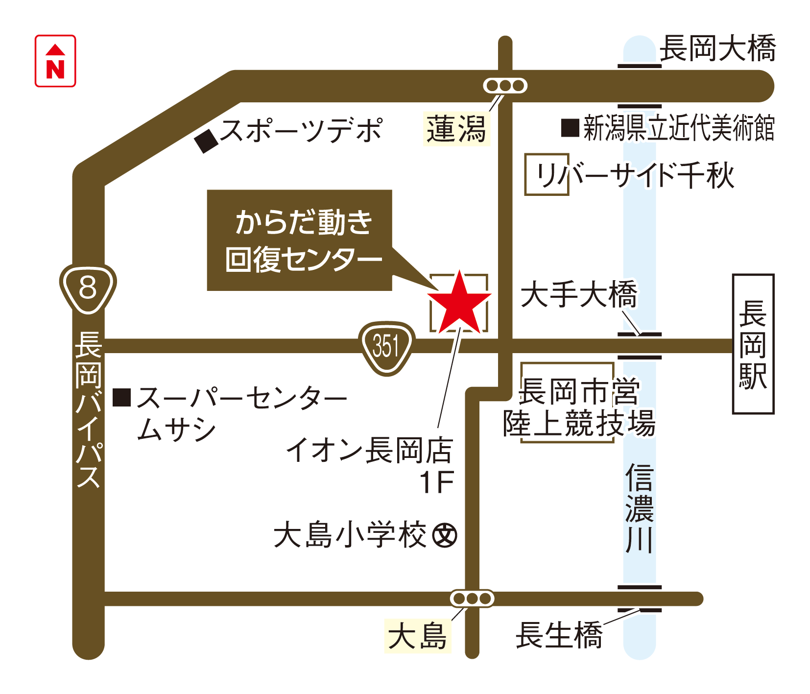 JR「長岡駅」大手口から、越後交通の路線バスをご利用いただき、イオン長岡店前で降車ください(約10〜15分)。イオン長岡1階東入り口付近、イオン内郵便局さんのお隣がからだ動き回復センターです