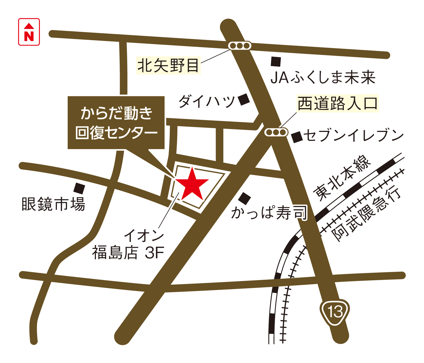 JR「福島駅」(東口)から福島交通の路線バスが運行されています。福島駅東口 9番乗り場より「イオン福島」行、または「谷地前」行に乗車。「イオン福島店」バス停にて下車すぐ。イオン福島館内3階、くまざわ書店さんのお隣がからだ動き回復センターです