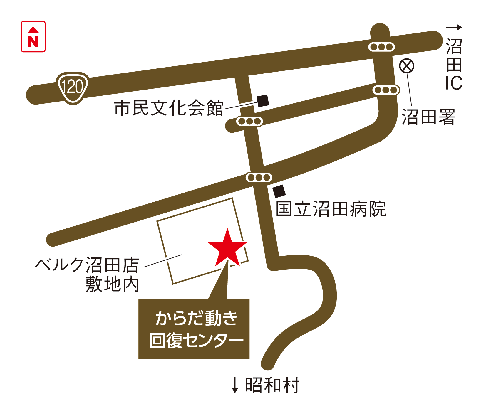 JR「沼田駅」前ロータリーよりバスをご利用ください。佐山線(田中行き等)に乗車しバス停「国立病院」にて降車、徒歩すぐにございます。ベルク沼田1階TOKYO SHOESさんのお隣がからだ動き回復センターです