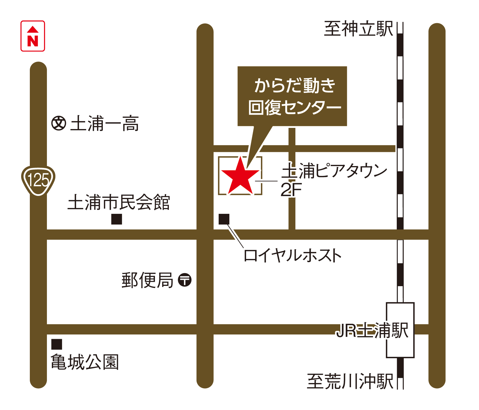 土浦駅西口4番より、土浦市「キララちゃん」バス⇒市民会館循環右回り⇒13番土浦ピアタウン下車すぐです。土浦ピアタウン2階エムズさんのお隣がからだ動き回復センターです