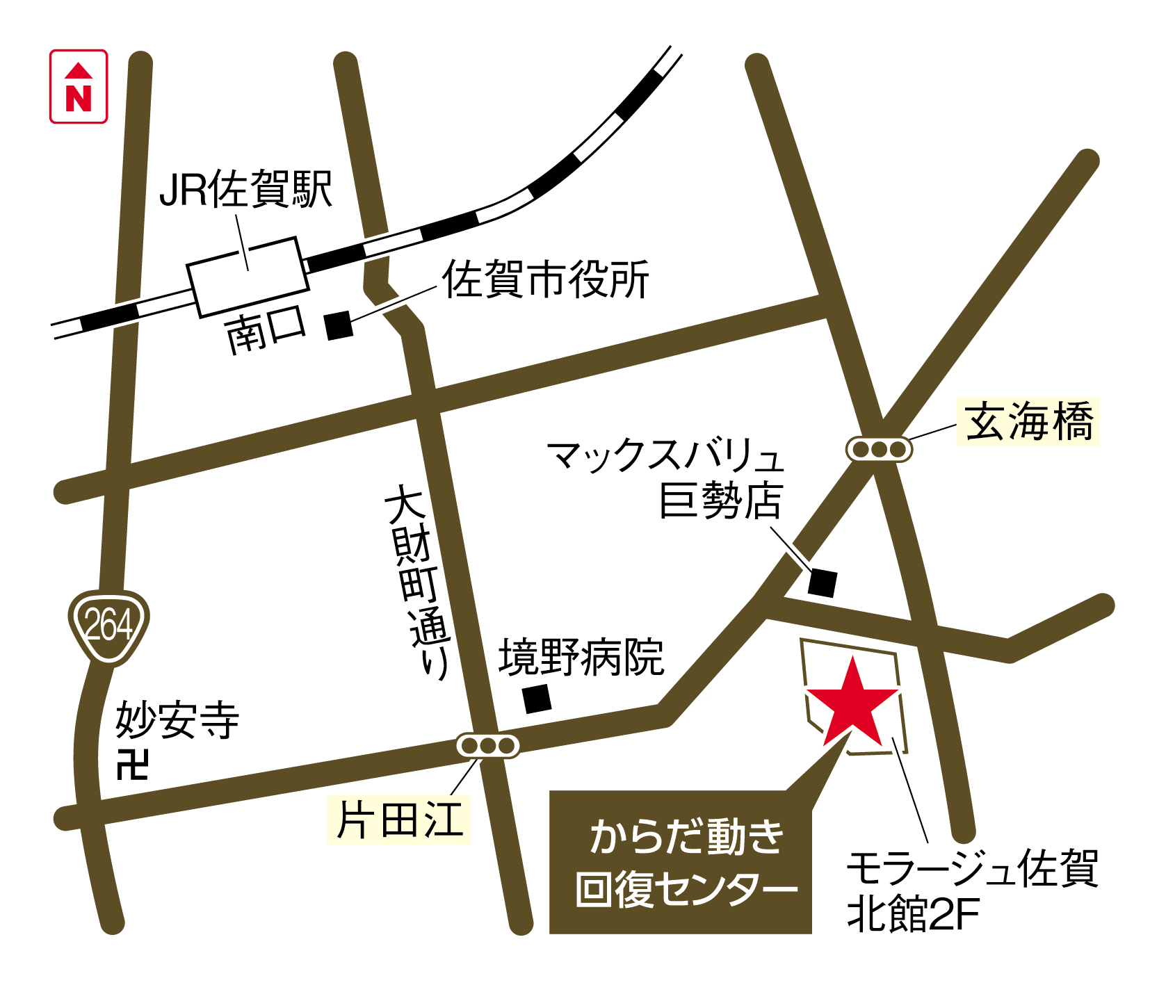 JR「佐賀駅」(佐賀駅バスセンター)から直通バスが運行されています。佐賀駅バスセンター乗り場より、祐徳バス「モラージュ佐賀線」に乗車、「モラージュ佐賀前」にて降車ください(約15分)。モラージュ佐賀北館2階、T.G.C.メガネさんのお隣がからだ動き回復センターです