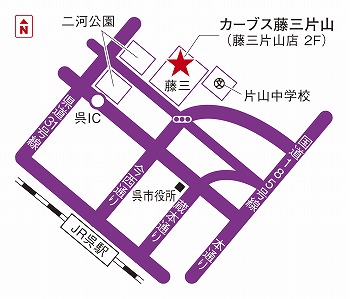 呉駅からバスで二河宝町線乗車。東片山町もしくは西片山町バス停下車。藤三片山店さんの2階。