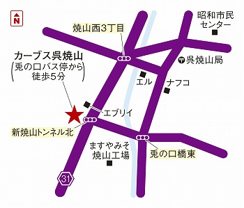 県道31号線呉方面から新焼山トンネル抜けてすぐ左。