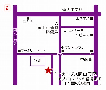 岡山西バイパスの御南中口交差点を東へ直進し、3つ目の交差点を左折します。直進した右側にあるヘアパーククレイヴァさんの手前左側がカーブス岡山辰巳店です。