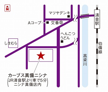 ニシナフードバスケット真備店さん西側入り口を入り、ニシナフードバスケット真備店さん服飾売り場とSeriaニシナフードバスケット真備店さんの間の通路を真っ直ぐ進んだ突き当たりがカーブス真備ニシナ店です。