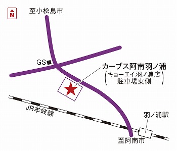 キョーエイ羽ノ浦店さんの向い、白い外観の建物の1階がカーブス阿南羽ノ浦店です。