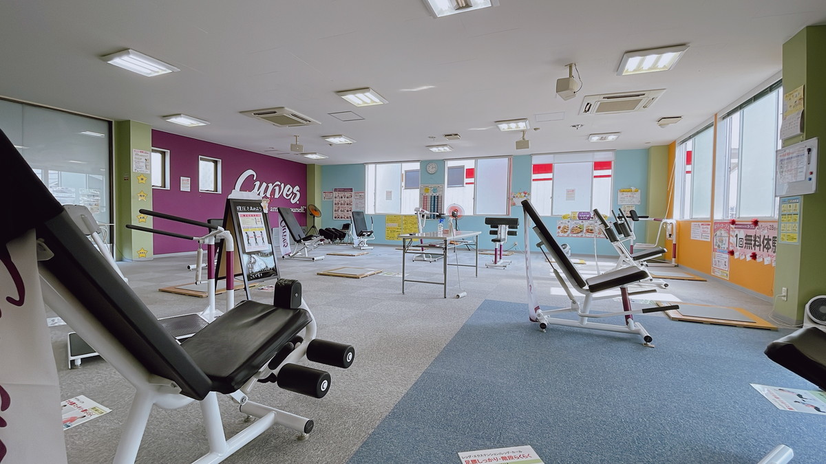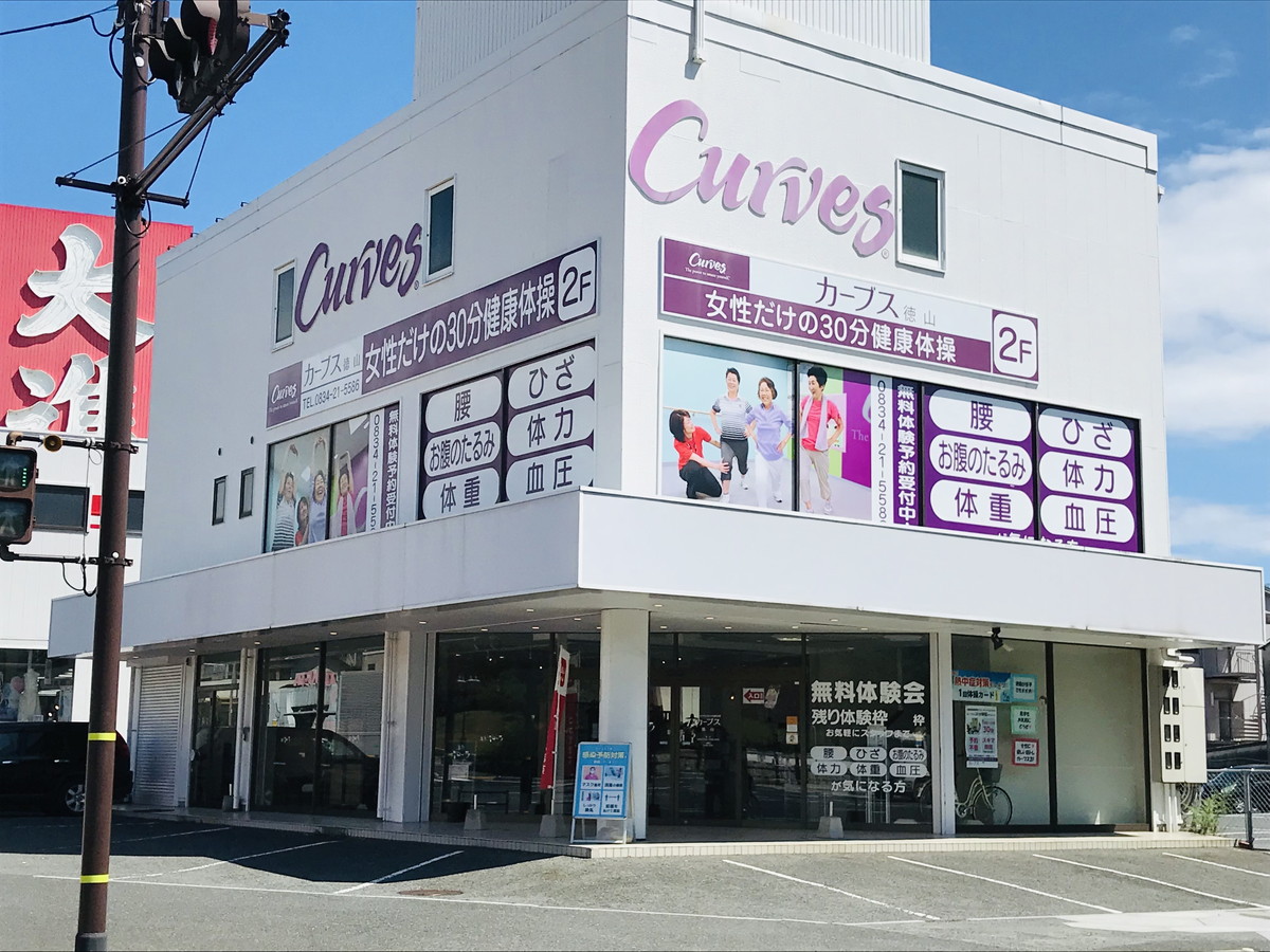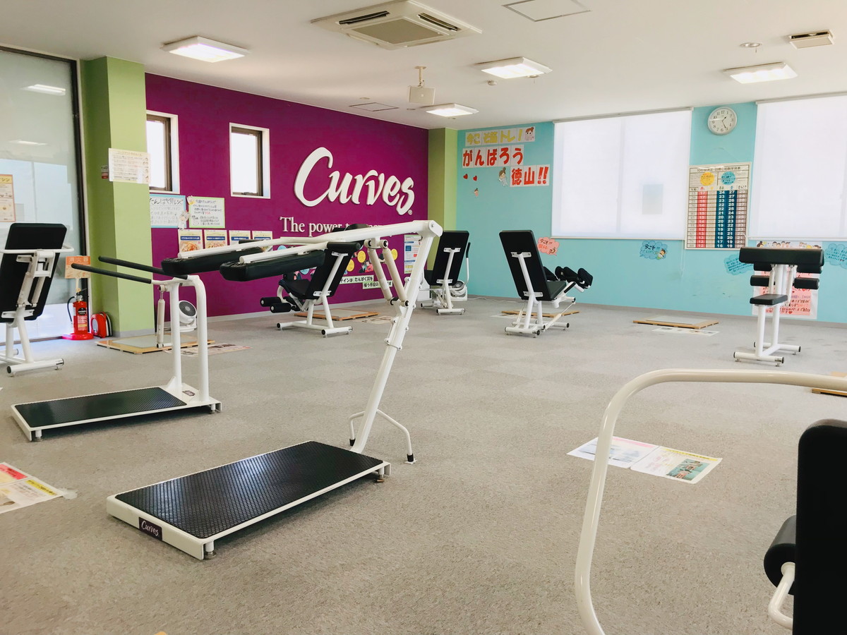 動物園文化会館入口停留所から、左へ直進し、信号を渡ります。カバさんの地下道入口の目の前に白と紫色の外観の建物2階がカーブス徳山店です。