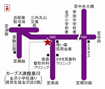金沢小学校通り、金沢生協さん2階にあります!青森みちのく銀行さんATMのある入り口から入ってすぐの階段をのぼってきていただくとお店があります!お車でお越しの方は2階にも駐車場ございます! -