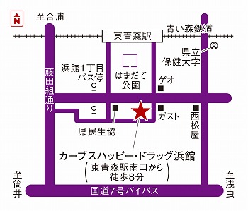 東青森駅から徒歩10分、バス停 浜館1丁目より徒歩3分、スコール浜館店さん向かえ、ガスト青森浜館店さん隣です。