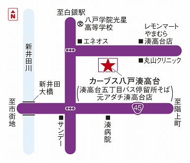 八戸市営バス[湊高台5丁目]停留所から徒歩1分。