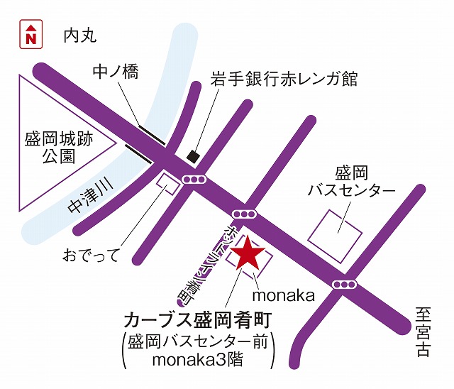 盛岡市内バスで盛岡バスセンター行き。盛岡バスセンターから徒歩2分。monakaバスセンター口のエレベーターで3階に行き、らく助接骨院・整体院さんを右折しますと目の前がカーブス盛岡肴町です。