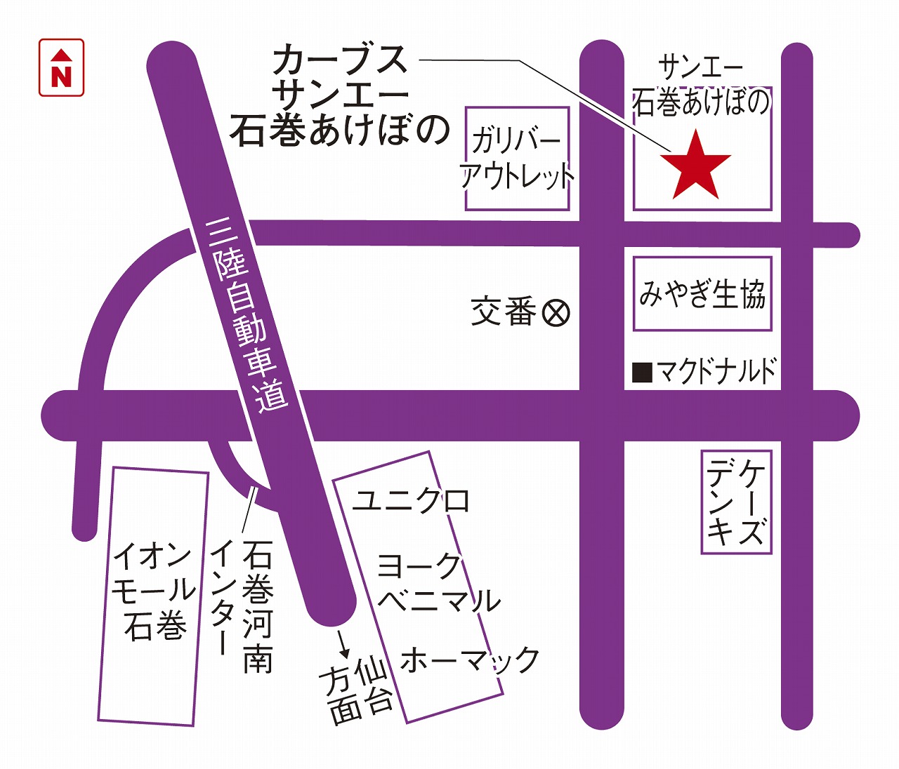 三陸道石巻河南IC入口を右折(石巻市街地方面)16号線沿いのマクドナルド蛇田店様を、目印に交差点を左折します。