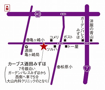 国道7号線みずほ交差点にあるガーデンパレスみずほさん側へ1km進むと、左手に見える大山内科さんの隣、紫色の屋根の建物がカーブス酒田みずほ店です。