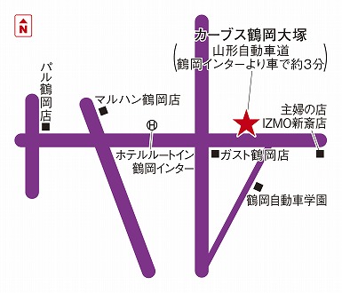 山形自動車道 鶴岡インターより車で約3分。旧7号沿いにあります。 -