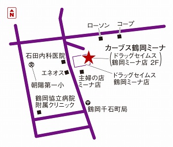セイムスさんに向かって左隣りにある自動ドアから中へ。階段またはエレベーターで2階に上がり、突き当たり奥に店舗があります。