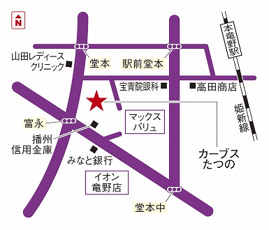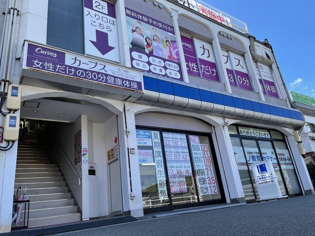 JR姫新線本竜野駅改札を出て右手階段を降り西に直進 本竜野郵便局を左折 一つ目の信号右折 そのまま直進 マックスバリュ様駐車場過ぎすぐ左折 20m直進 右手1F J教育セミナーの2Fがカーブスたつの店