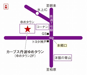 ゆめタウン正面東出入口入ってすぐ右手のエレベーターまたは階段で2階へ上がりすぐ左手にあります。