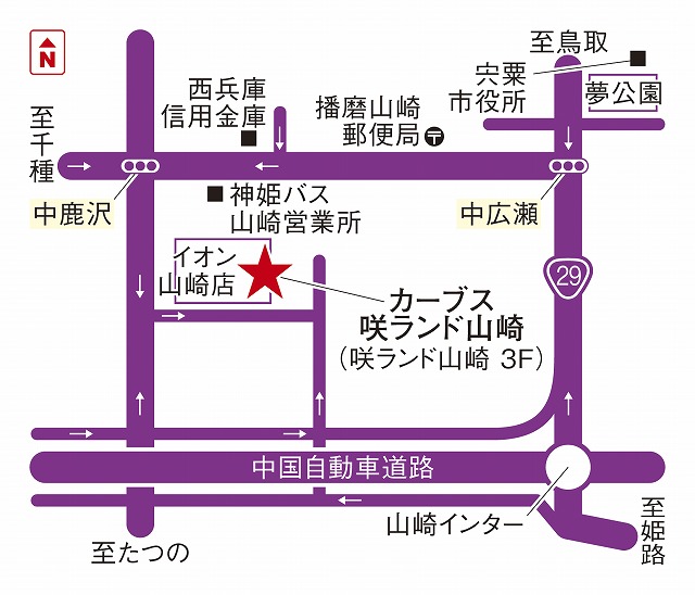 AEON山崎店 神姫バス山崎停留所より徒歩5分、AEON東側入口から、エスカレーターで3階に行き、降りたらすぐ左、手芸の丸十さんの隣