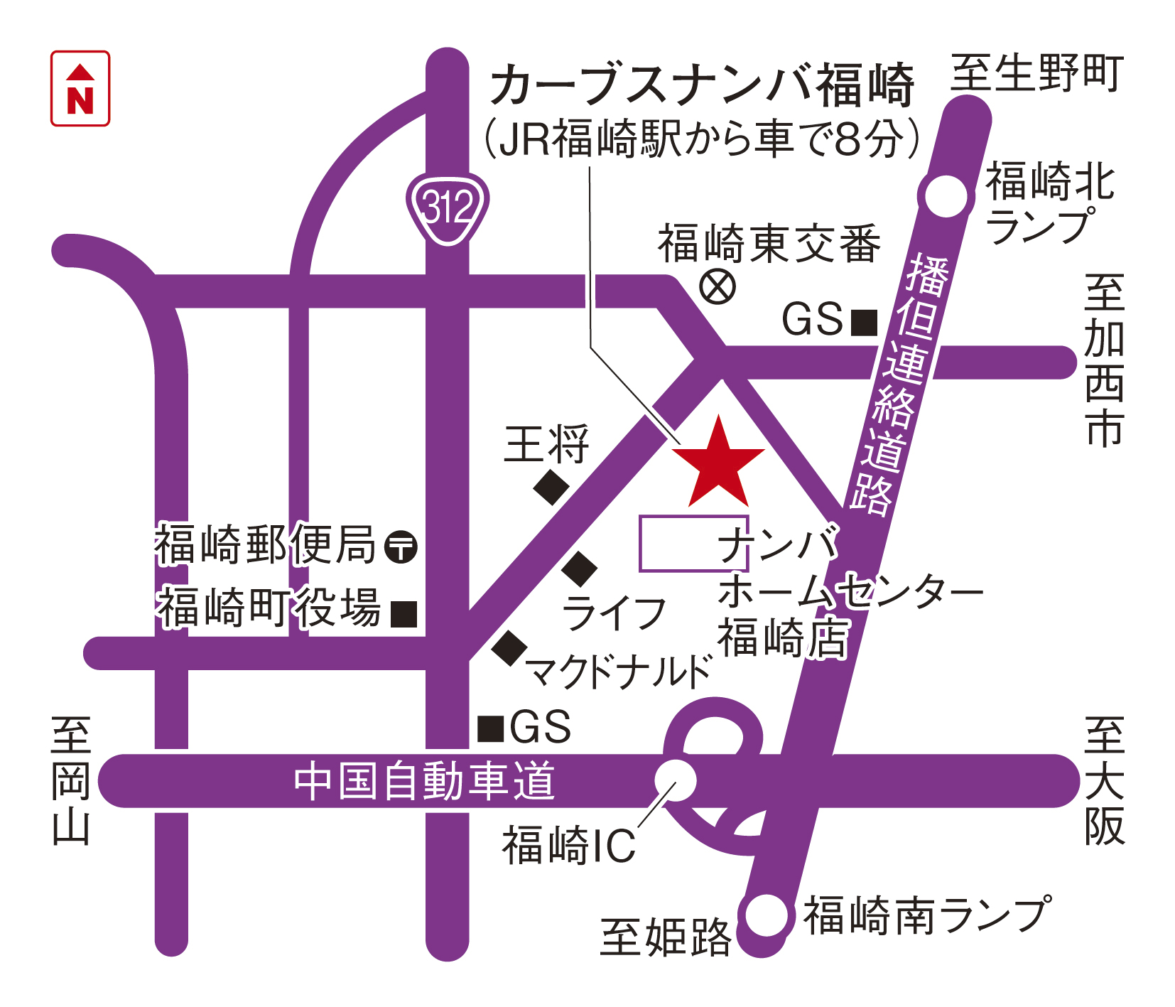 田尻住宅(ナンバ前)バス停から徒歩2分。JR福崎駅から車で8分。県道23号線の福崎町役場前交差点より車で2分。ナンバホームセンター福崎店さんのお隣の建物がカーブスナンバ福崎です。
