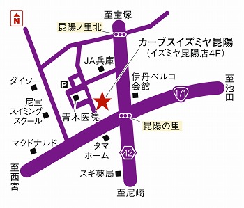 イズミヤ昆陽店の4階エレベーターをおりて真っ直ぐ進んでいただくと入り口があります!1階でお買い物したついでにパッと行けます! -