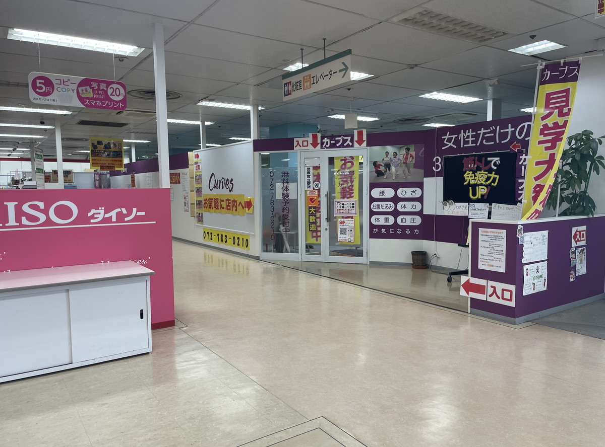 イズミヤ昆陽店さんの正面玄関から入って、エスカレーターで4階、降りてすぐ、ダイソーさんレジ横にカーブスがあります!