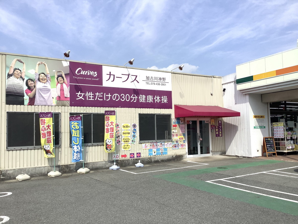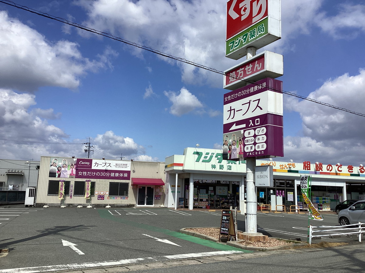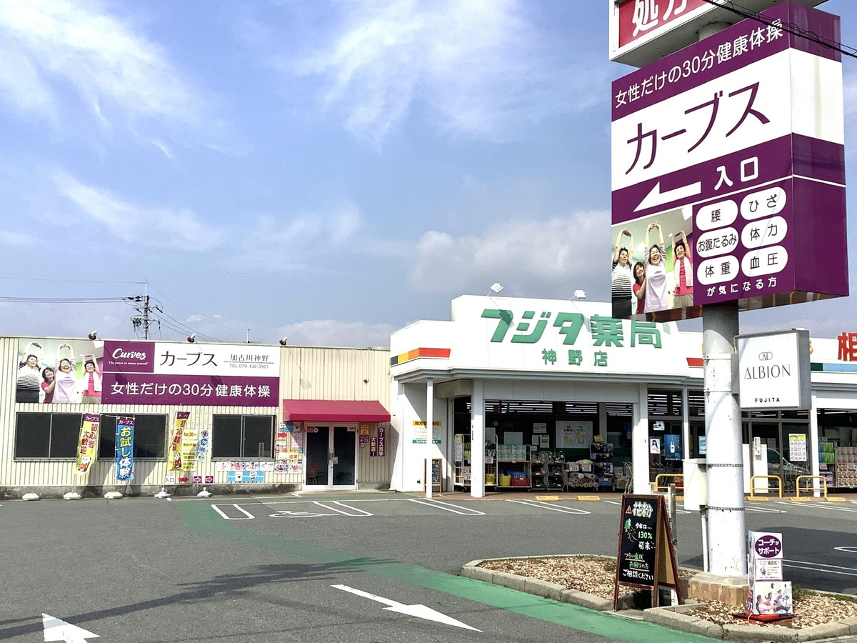 「新神野7丁目」交差点を北進してすぐ左側のフジタ薬局神野店のお隣りがカーブス加古川神野店です